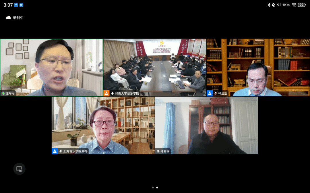研讨会采取线上线下相结合的方式进行,河南大学音乐学院的部分师生在学院主会场参加会议,国内兄弟院校的学界同行、专任教师、本科生和研究生通过线上平台参会。研讨会由安徽师范大学音乐学院院长、博士生导师汪海元教授主持,陈文革教授担任学术评议。