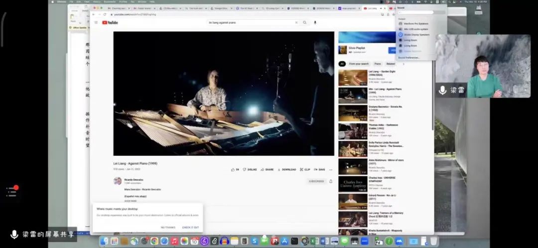 梁雷教授回忆起自己本科期间在哈佛大学结识的许多非音乐专业的好友,其中与他关系最为密切的一位好友是来自韩国的建筑家——金钟振先生。梁雷教授和金钟振先生相识于书店,由于志趣相投,就保持联系。对建筑方面的好奇心驱使梁雷教授经常前往建筑学院图书馆观看相关书籍和电影,与金钟振先生进行讨论交流。虽然梁雷教授与金钟振先生交流的内容与音乐上看似毫无关联,但实质上,建筑学的空间、影子、纹理、材料、色彩等命题是直接切入音乐的核心命题。金钟振先生对声音非常敏感,梁雷教授也是根据金钟振先生分享的一个美好的故事创作了一首钢琴曲《反钢琴》。故事内容是金钟振先生在暑假回到韩国,到山上寻找庙宇,在山路时因为突如其来的大雨迷路。在白茫茫的大雨中,只剩下风声、雨声和青蛙的叫声,就像一部交响乐一般,金钟振先生感觉整个世界都消失在了这部交响乐中。当这首钢琴曲在录音室制作的时候,梁雷教授也邀请金钟振先生同往,一起聆听这首曲子。金钟振先生却要求躺在三角钢琴下面感悟这首钢琴曲的音响。这首曲子是梁雷教授寻找声音体现的一次精彩实验。
