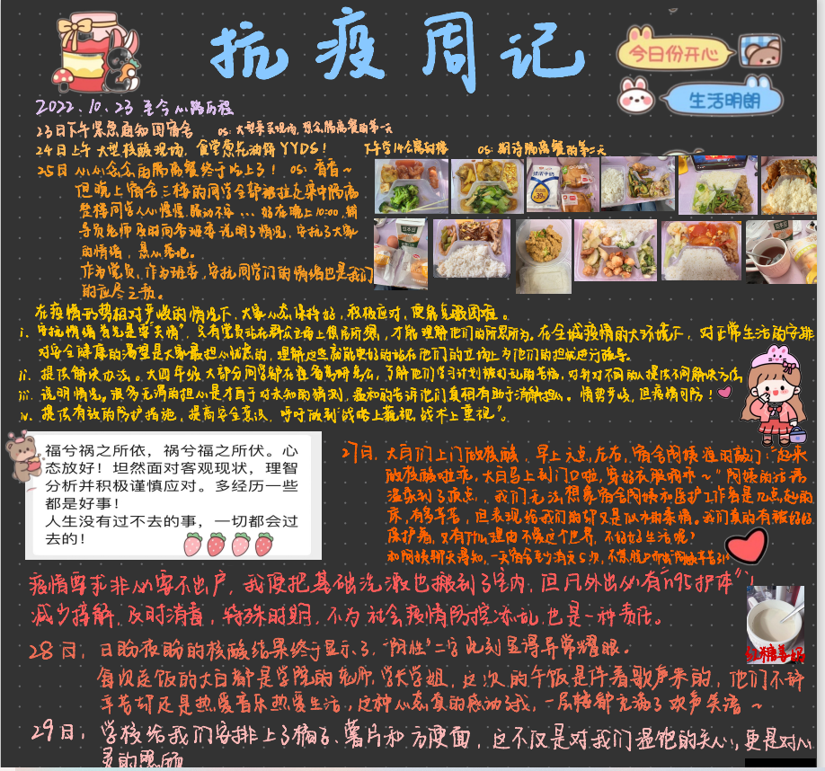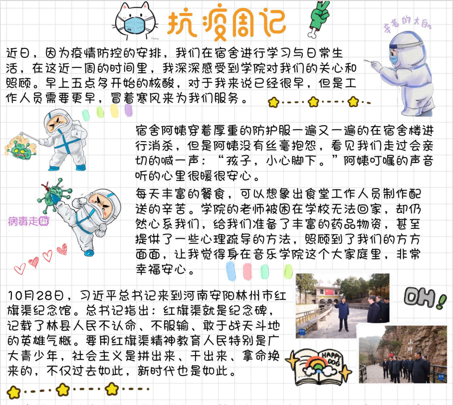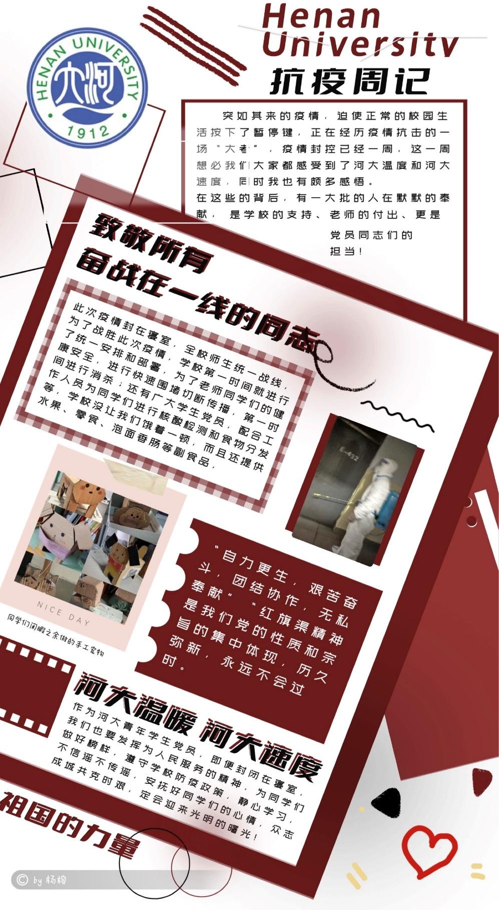 本科生第一党支部党员通过支部“抗疫周记”活动,将理论学习与同学校抗疫实际结合起来,在党的二十大报告与习近平总书记在陕西延安、河南安阳考察时的讲话中寻找当代中国青年的人生坐标,将感悟写在一篇篇抗疫周记中,力争在学校疫情防控工作中交上一份优秀的答卷。