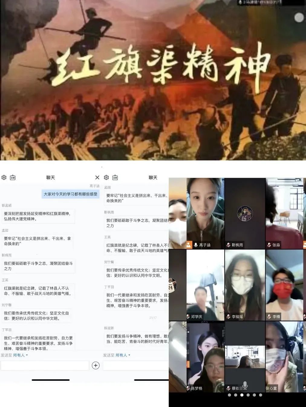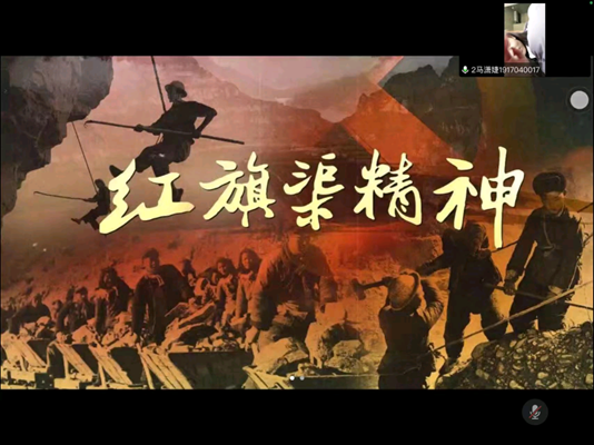 习近平总书记在调研中强调,红旗渠就是纪念碑,记载了林县人不认命、不服输、敢于战天斗地的英雄气概。通过这次的学习,本班同学明白了红旗渠精神同延安精神,是一脉相承的,是中华民族不可磨灭的历史记忆,永远震撼人心。年轻一代要继承和发扬吃苦耐劳、自力更生、艰苦奋斗的精神,摒弃骄娇二气,像我们的父辈一样把青春热血镌刻在历史的丰碑上。