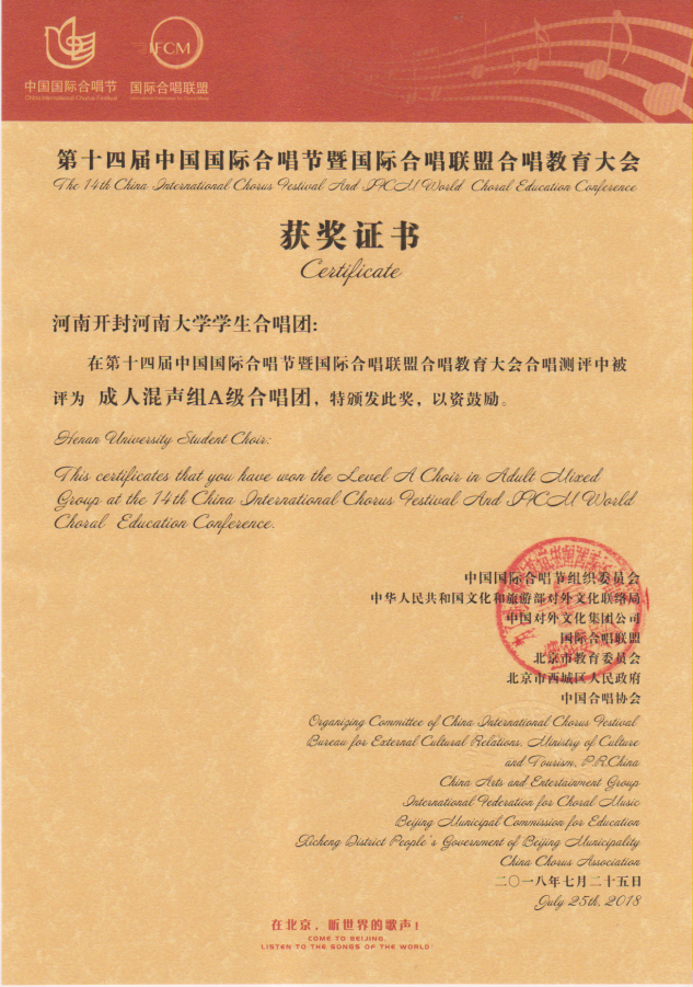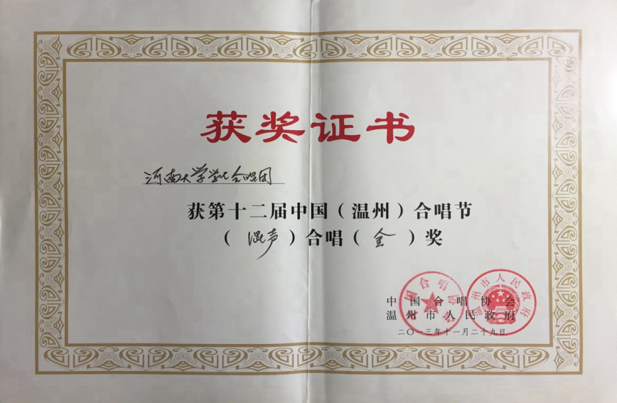 河南大学至善合唱团由我国著名指挥家、作曲家、教育家陈家海教授创办,音乐学院副院长韩梅教授任团长,袁凯副教授任指挥,是一支文化修养深厚的优秀学生社团,在世界合唱比赛(World Choir Games)、中国音乐金钟奖合唱比赛、教育部大学生艺术展演、中国合唱节、中国国际合唱节、中国嘉陵江合唱节、中国黄龙洞国际合唱艺术周、中国黄河合唱周、河南省音乐金钟奖合唱比赛、河南省合唱节等国内外合唱重要赛事中屡获殊荣。