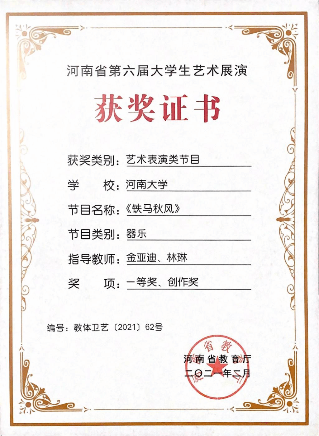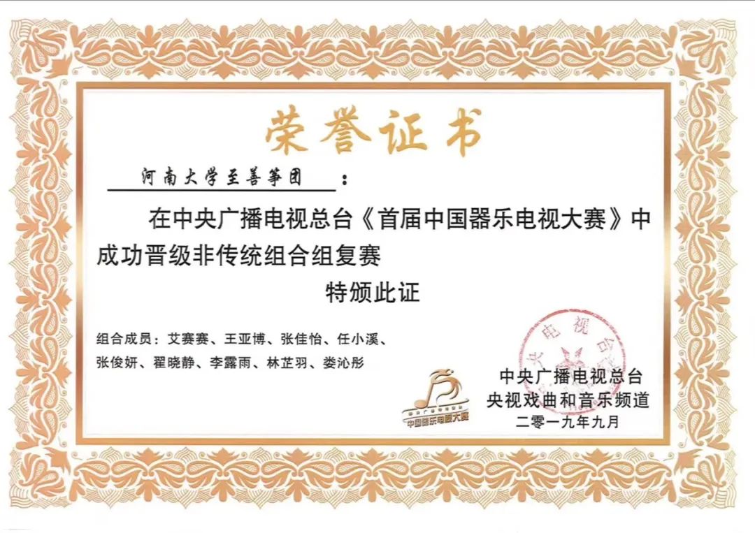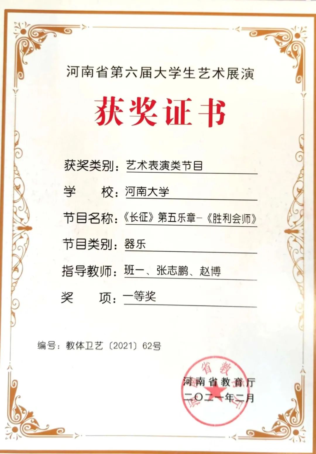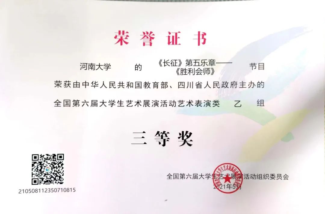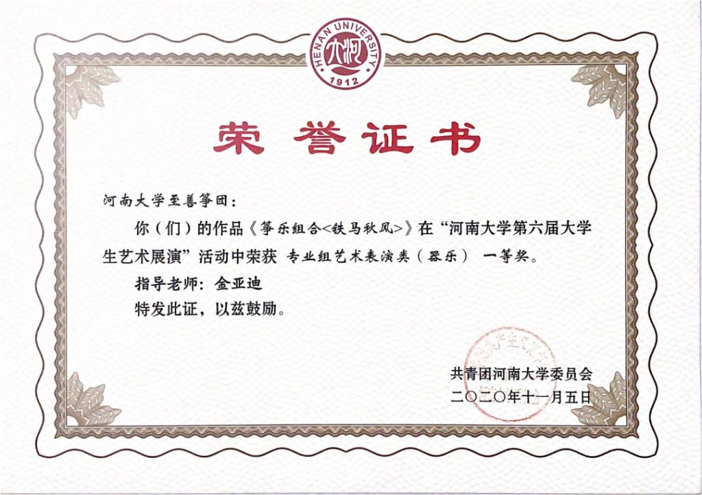 2020年12月,河南大学至善交响乐团荣获“全国第六届大学生艺术展演河南赛区一等奖”,并参加了河南省教育厅在周口师范学院举办的河南省第六届大学生艺术展演器乐专场现场展演。2021年5月获“全国第六届大学生艺术展演专业组三等奖”。