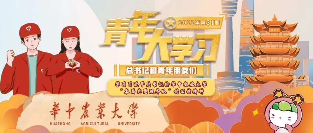 志愿服务是社会文明进步的重要标志。党的十八大以来,广大青年志愿者弘扬和践行社会主义核心价值观,走进社区、走进乡村、走进基层,为他人送温暖、为社会作贡献,充分彰显了理想信念、爱心善意、责任担当,成为人民有信仰、国家有力量、民族有希望的生动体现。在中国青年志愿者行动实施20周年暨第二十八个国际志愿者日的时候,华中农业大学“本禹志愿服务队”的同学们给总书记写信,汇报了1200多名队员深入贫困山区支教、关爱留守儿童、关爱进城农民工子女、关爱老人和残疾人等志愿服务活动成果及他们的认识体会。2013年12月5日,习近平总书记给华中农业大学“本禹志愿服务队”回信,肯定他们在服务他人、奉献社会中取得的成绩和进步,勉励广大青年积极弘扬奉献、友爱、互助、进步的志愿精神,坚持与祖国同行、为人民奉献,以青春梦想、用实际行动为实现中国梦作出新的更大贡献,并向这支志愿服务队和全国广大青年志愿者致以诚挚问候和崇高敬意。本期我们来到华中农业大学,一起学习感悟习近平总书记对新时代青年志愿者事业的亲切关怀!完成这一期的学习,今年的“青年大学习”网上主题团课就要暂时告一段落了。这一年以来,我们每周与超过6500万团员青年们相互陪伴、一起学习,在“党领导百年中国青年运动的重大成就和历史经验”专题中,一起感悟党团结带领一代又一代中国青年为实现中华民族伟大复兴的中国梦接续奋斗的壮丽篇章;在“总书记与青年朋友们”专题中,共同感悟习近平总书记对青年一代的关心关爱和殷切期望,总书记的勉励与嘱托声声入耳、句句入心,鼓舞着我们在全面建设社会主义现代化国家的火热实践中贡献青春力量;党的二十大召开后,我们从9个方面带领大家深入学习党的二十大精神,党的二十大精神如火如炬,指引着我们青年一代在中华民族伟大复兴的新征程中砥砺前行、拼搏奋进。悄然间2022年即将走至尾声,理论学习聚沙成塔,积水成渊,贵在坚持。在新的一年里,让我们持续深入学习宣传贯彻党的二十大精神,更加紧密地团结在以习近平同志为核心的党中央周围,继续用青春谱写新时代新征程更加绚丽的华章!祝大家寒假快乐,我们下学期再见!