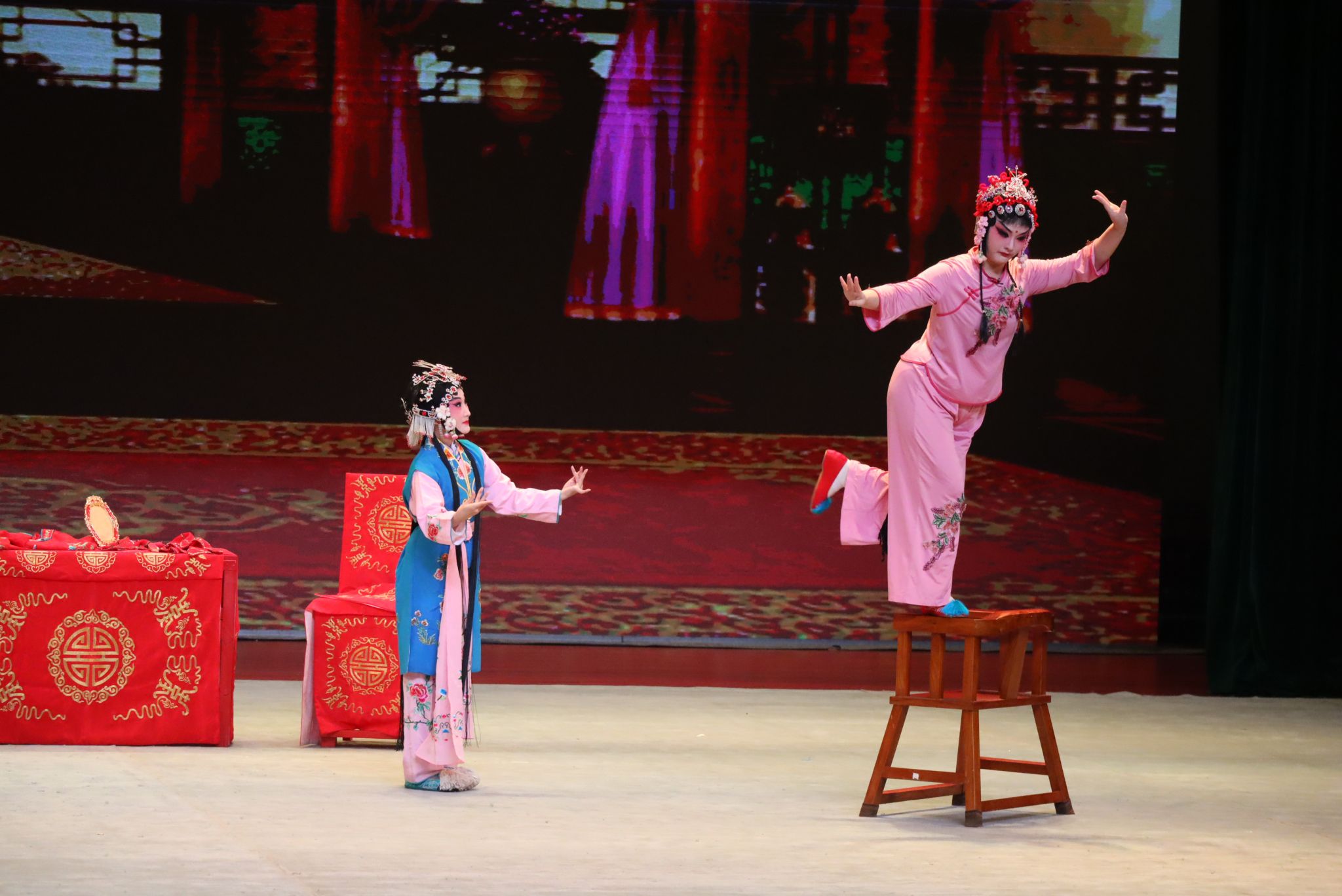 代表团精心准备的经典折子戏专场包含有豫剧《花木兰》《西湖公主》和曲剧《寇准背靴》《梵王宫》等剧目,同学们各显神通,将“甩发功”、“踢靴功”、“手绢功”等绝活、技巧充分展示出来,获得国际友人及全国参演院团同仁的认可和称赞。广西民族大学的泰国博士生罗佳明看完《花木兰·征途》后说:“我非常喜欢花木兰,小时候就看过中国动画片《花木兰》,后来在中国文化课上对花木兰的故事有了更深的了解。”见他如此喜欢花木兰,花木兰的饰演者任瑞雪特地为他讲解并示范了戏曲枪法,罗佳明还饶有兴致地体验了一番。