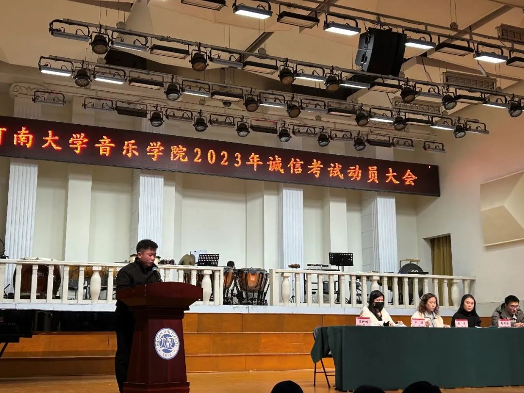 2023年诚信考试动员大会在音乐厅顺利召开。院党委副书记柴芳、院团委负责人赵瑞新、教务处陈金鹏、2022级辅导员卢琪、2023级辅导员王计鹏及2022级、2023级全体本科生参加本次大会。会议由王计鹏主持。