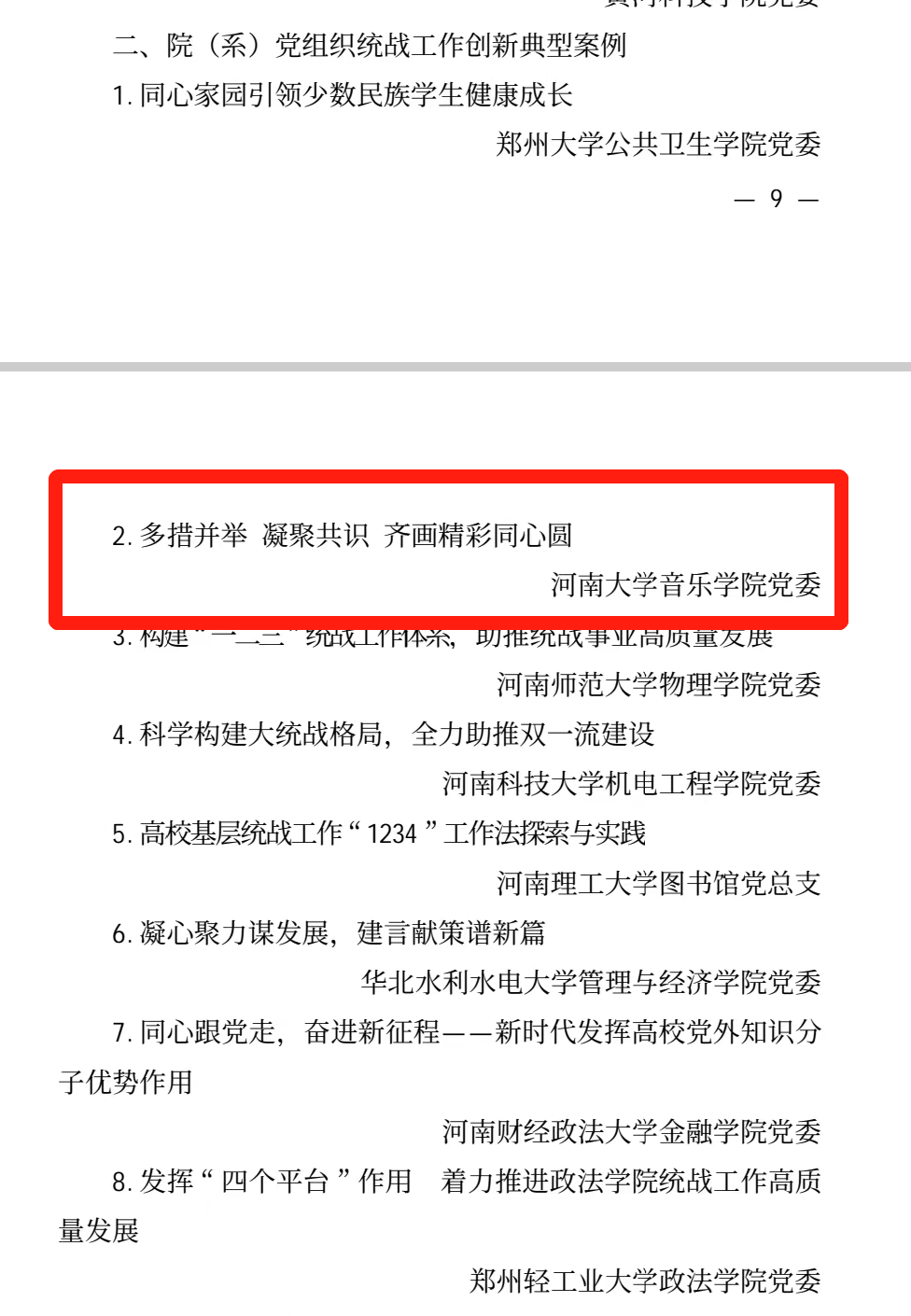 1月18日,在河南省高校2022年度统战工作中,我院党委的“多措并举 凝聚共识 齐画精彩同心圆”工作案例获得“2022年度河南省高校院(系)党组织统战工作创新典型案例”。在校党委、行政的正确领导下,音乐学院坚持以习近平新时代中国特色社会主义思想和党的二十大精神为指导,立足专业优势,通过开展内涵丰富的思想政治引领活动,不断夯实思想基础、建设有效载体、搭建工作平台,开展“同心共识”系列活动,不断构建完善“大统战”工作格局,齐画精彩同心圆。