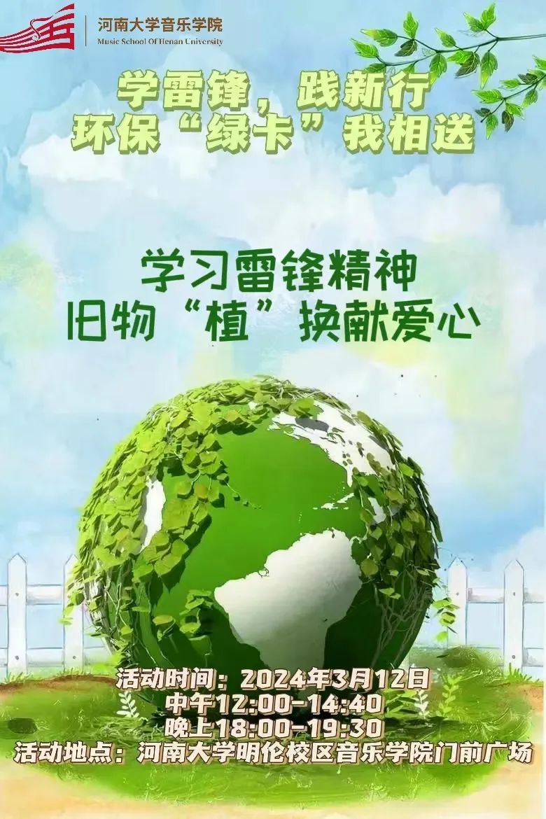 雷锋月,为了弘扬雷锋精神,引领带动校园文明新风尚,提高学生勤俭节约环保的意识,音乐学院团委将于2024年3月12日“植树节”当天举行雷锋月“学习雷锋精神 旧物“植”换献爱心”之我为环保做件事活动。此次活动为了丰富广大在校生的课余生活,培养学生的环保、回收节约意识,给同学们提供一个以可回收资源换绿植的爱心公益平台,为文明校园建设贡献力量。