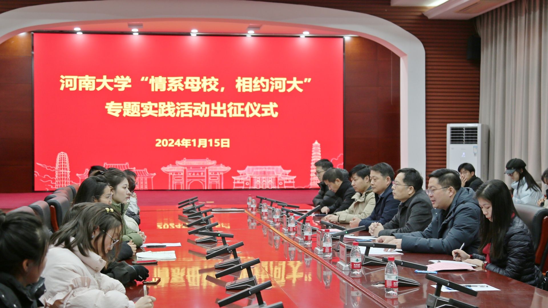 1月15日上午,我校在明伦校区小礼堂举行2024年“情系母校,相约河大”在校生寒假返母校招生宣传专题实践活动出征仪式。校团委书记龚森、招生办公室主任樊小勇出席会议,校团委相关领导、招生办公室全体成员以及团队成员代表参加活动。