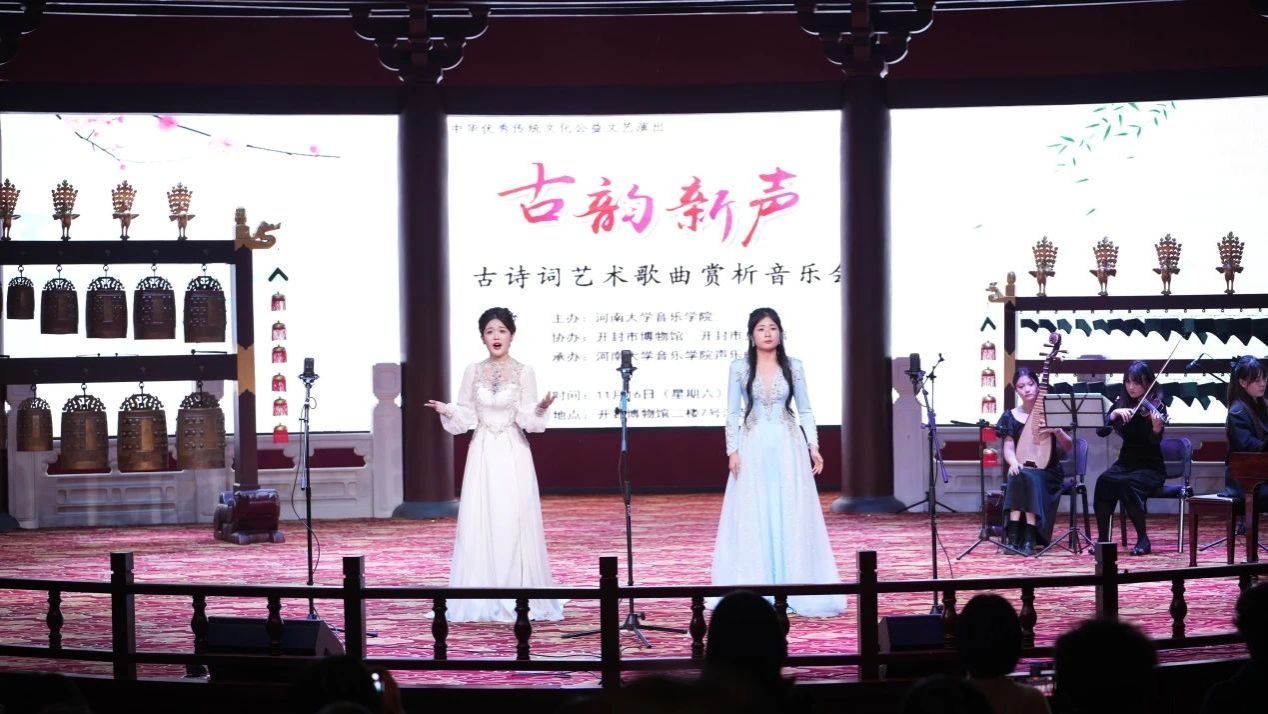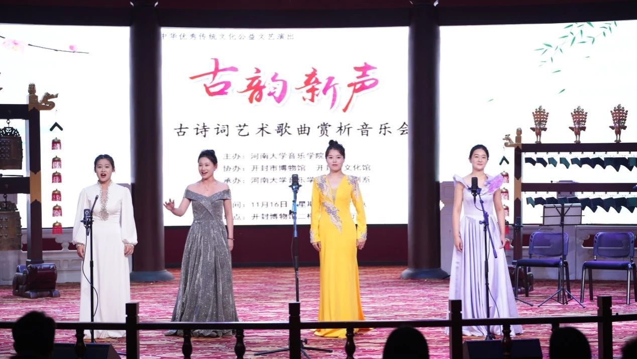 助力开封文旅,添彩菊花花会。为了提升学科专业服务地方文旅产业发展的能力和水平,大力弘扬和传播中华优秀传统文化, 11 月 16 日下午,由河南大学音乐学院主办,开封市博物馆、开封市文化馆协办、河南大学音乐学院声乐歌剧系承办的“中华优秀传统文化公益文艺演出系列活动”之一,“古韵新声”古诗词艺术歌曲音乐会,在开封市博物馆二楼演艺厅精彩上演。开封市博物馆副馆长郑海涛、开封市文化馆副馆长彭舒、副馆长张华,河南大学音乐学院副院长王新、声乐歌剧系副主任虎翼,以及各地游客观众共同观看了音乐会。河南大学音乐学院本科生、研究生参加演出。