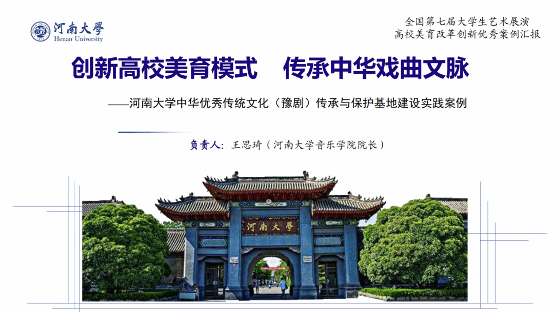 音乐学院王思琦主持的工作项目《创新高校美育模式 传承中华戏曲文脉--河南大学中华优秀传统文化(豫剧)传承与保护基地建设实践案例》获全国高校美育改革创新优秀案例一等奖,音乐学院王聚伍、袁凯、刘佳指导的《天下黄河》、《Flight of the bumble-bee》获声乐类全国一等奖,音乐学院王聚伍、赵博、张志鹏指导的《热巴舞曲》获器乐类全国一等奖,新闻与传播学院谷小龙、孙玉婷、金冰冰指导的朗诵《红旗渠》获全国朗诵类一等奖。