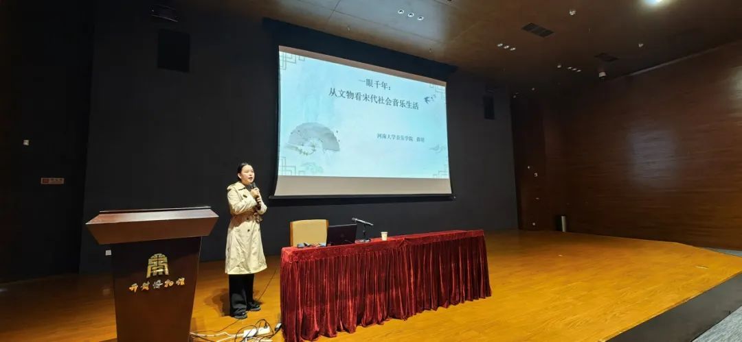 11月3日上午,河南大学音乐学院副教授、硕士生导师薛培博士做题为“一眼千年:从文物看宋代社会音乐生活”的专题讲座。薛培老师首先从宋代政治、经济、文化等多维视角,对宋代音乐文化繁荣的社会背景进行了概述。然后她以图文并茂的形式,从宫廷礼乐、民间音乐、宗教音乐和文人雅乐等四个方面对宋代的社会音乐生活进行详细介绍。